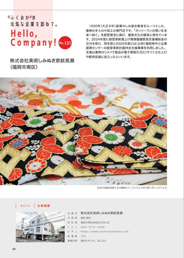 「ビジサポふくおか」に掲載されました 公開日:2026.02.2 / 最終更新日:2026.02.3 取り組み着物リメイクお知らせピックアップ シェア ツイート LINEで送る Pocket 福岡県中小企業振興センター発行の「ビジサポふくおか・2026年1月号vol.285」、 “ふくおか” の元気な企業を訪ねて。Hello,Company! No.131にて、 弊社の取り組みを紹介して頂きました。 これまでのメディア掲載については、こちらよりご覧ください。 コメントは受け付けていません。 シェア ツイート LINEで送る Pocket 前の記事へ« 成人式・振袖のお手入れ承ります